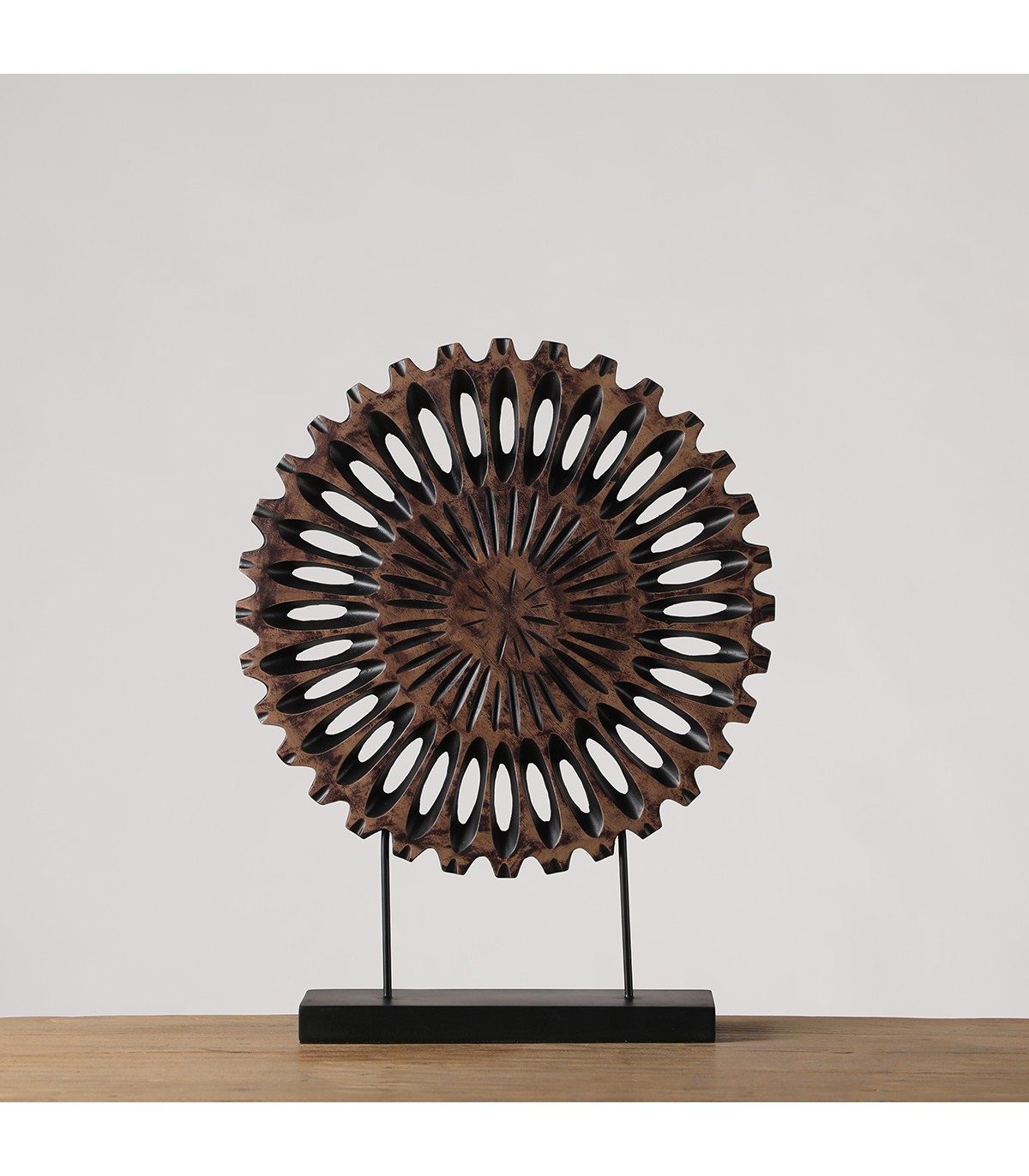 El Adorno Aymara es una pieza decorativa de fuerte identidad visual, diseñada para aportar carácter, profundidad y una estética distintiva a espacios interiores. Su diseño de inspiración étnica, junto a su acabado en poliresina color café, genera una presencia cálida y sofisticada.