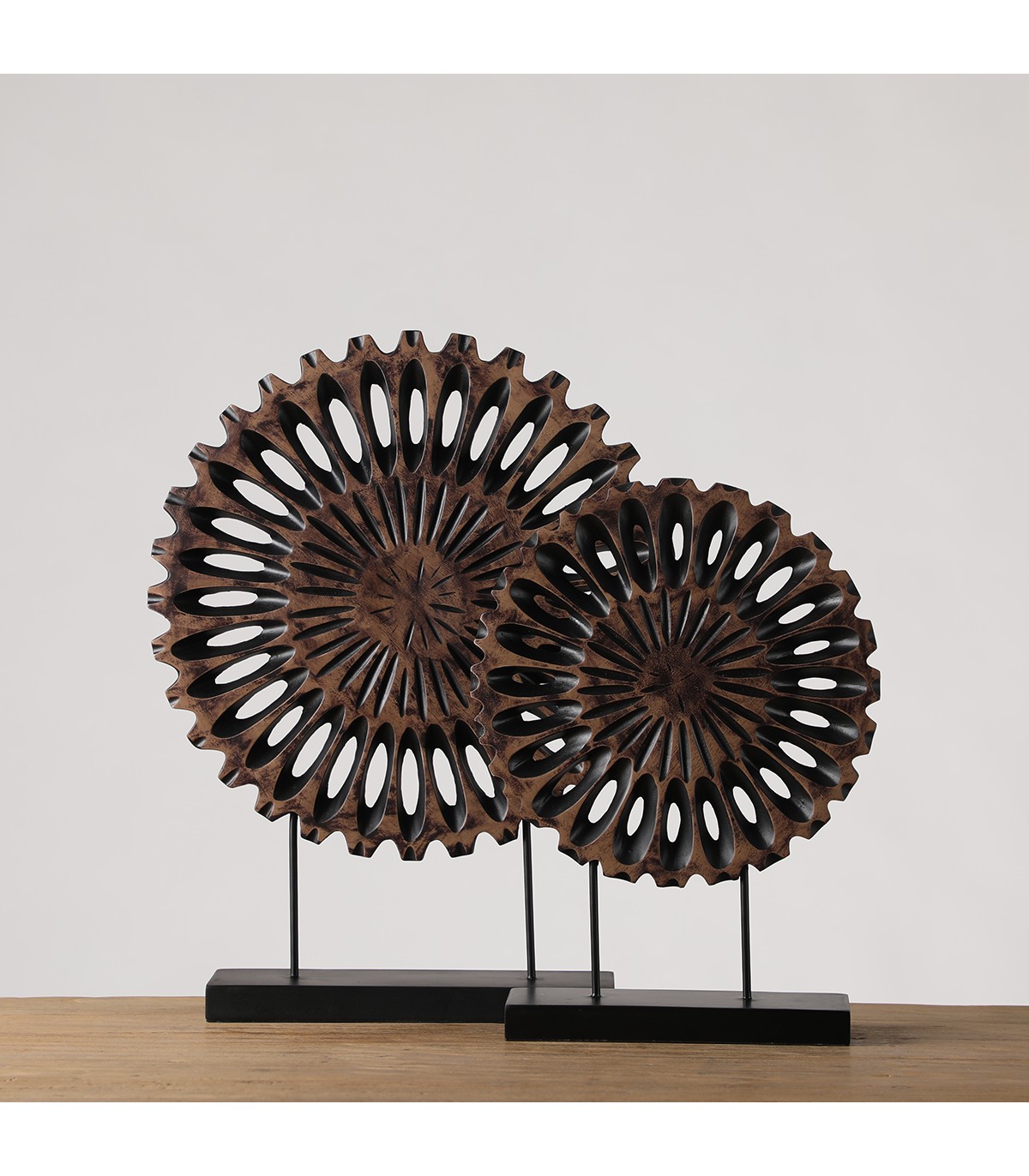 Fabricado en poliresina, presenta una terminación detallada que realza su diseño, convirtiéndolo en una escultura decorativa protagonista, perfecta para interiores contemporáneos, rústicos o de inspiración étnica.