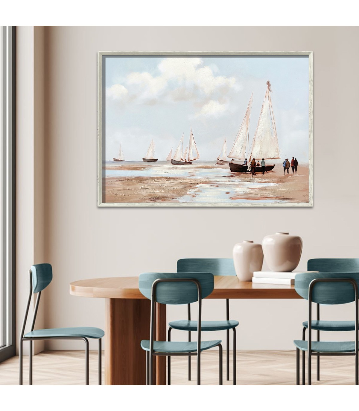 Calma costera en tonos suaves Obra pintada a mano sobre canvas HD, que combina colores celeste y beige en una composición serena que evoca paisajes naturales y horizontes abiertos. “La Bahía” transmite tranquilidad y amplitud visual, mientras el marco en madera natural acentúa su calidez y conexión con lo orgánico. Ideal para espacios relajados, costeros o de inspiración escandinava que buscan arte con luz y equilibrio. Características: Técnica: Pintura al óleo sobre canvas HD. Color predominante: Celeste y beige. Marco: Madera natural. Medidas: 70 cm (ancho) x 50 cm (alto) x 3 cm (profundidad). Origen: China. Una pieza horizontal con espíritu sereno, perfecta para ambientes que valoran el arte con inspiración natural y estilo contemporáneo.
