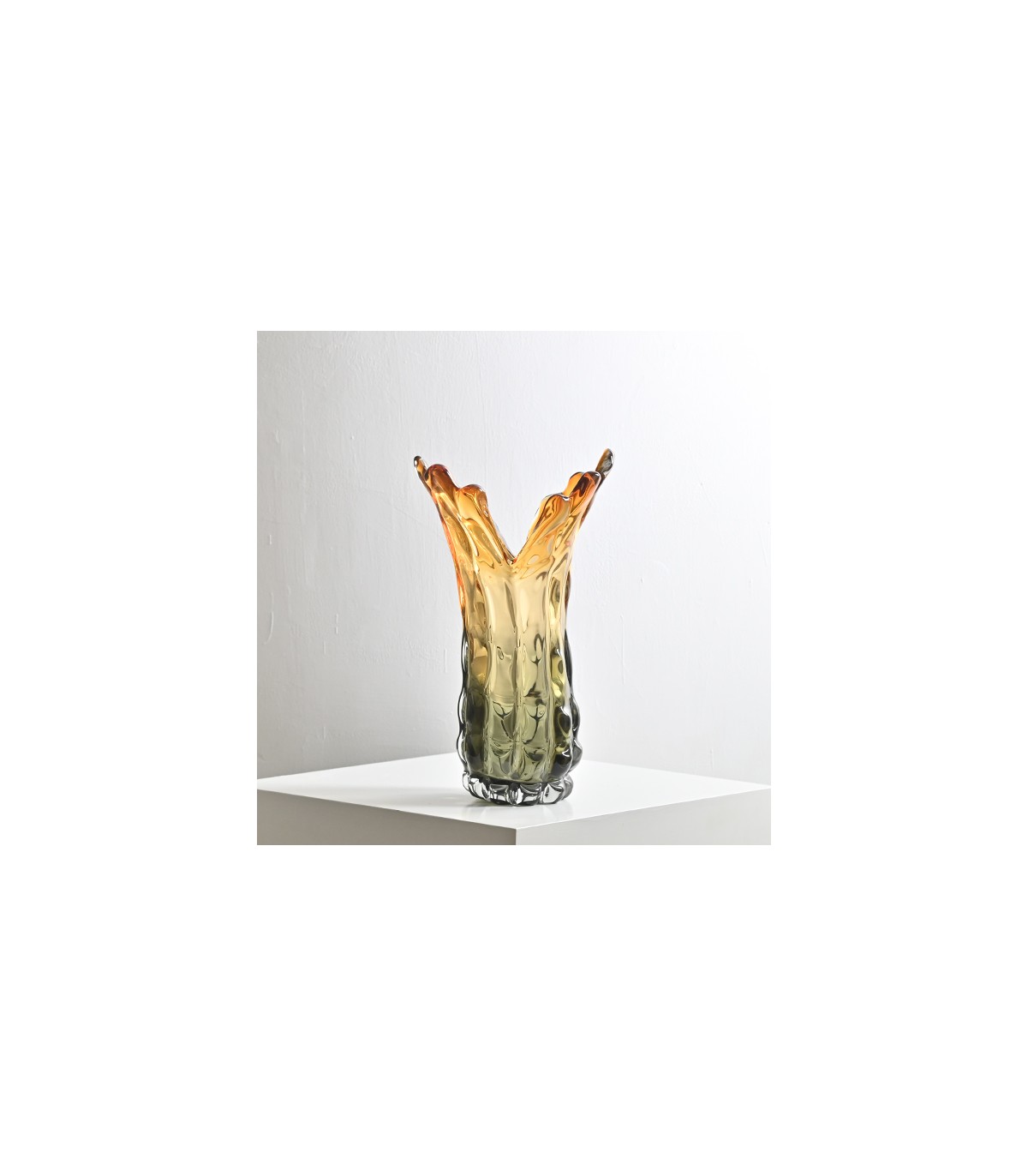 Florero en vidrio soplado con forma orgánica tipo volcán y degradé en tonos ámbar y gris. Una pieza escultórica que aporta movimiento y carácter al espacio.