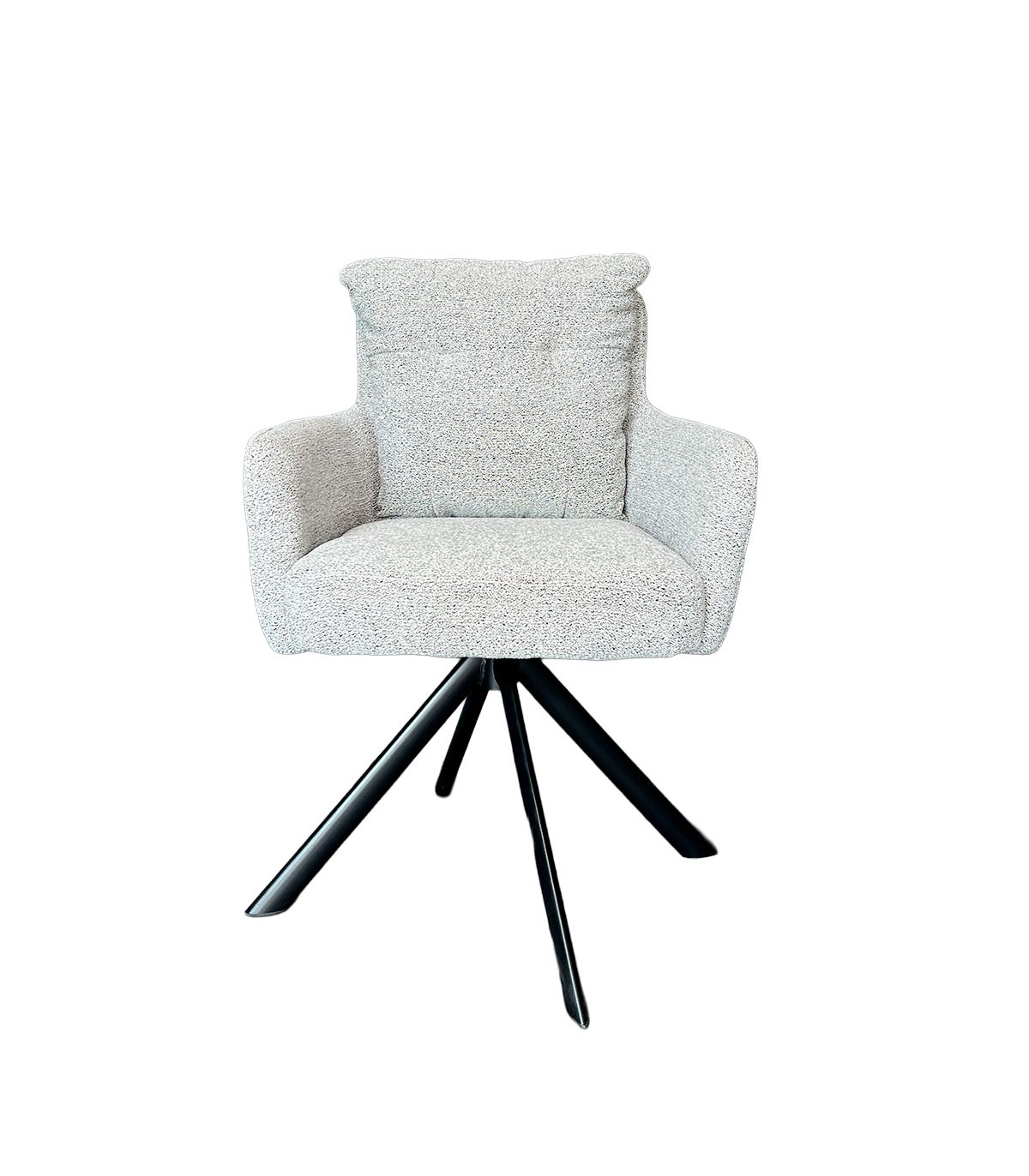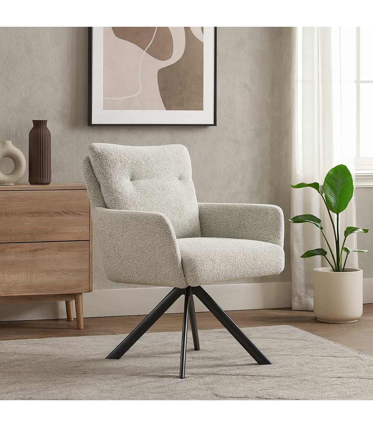 Silla Preston con brazos en tela beige, asiento con pocket spring y base metálica giratoria negra. Moderna, cómoda y versátil.